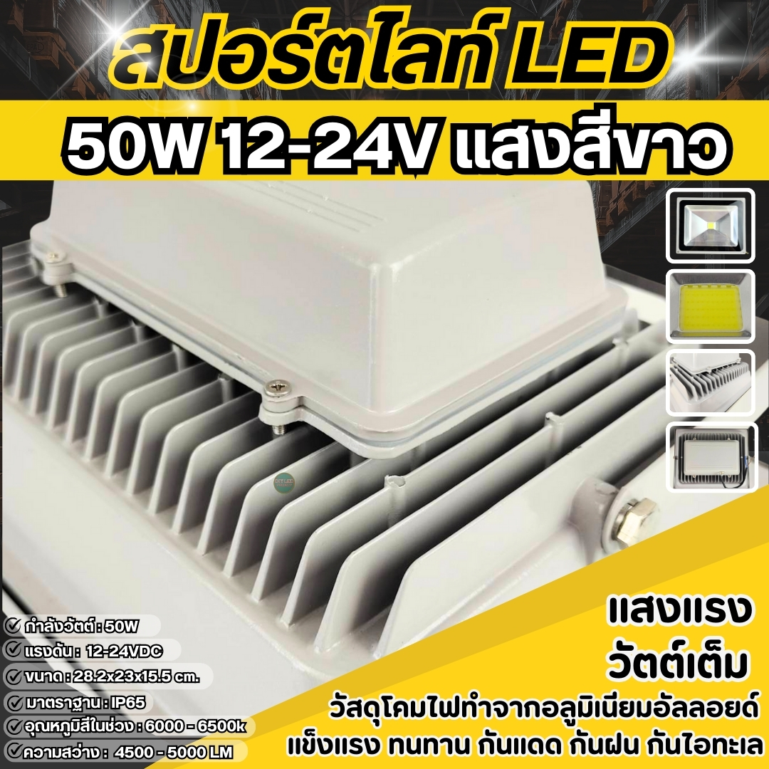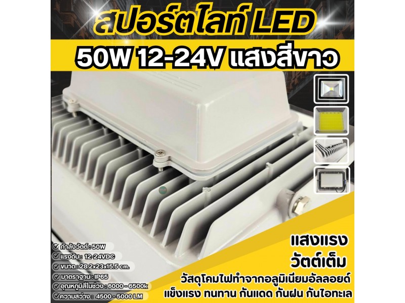 สปอร์ตไลท์ LEDตัวนี้เป็นอีกรุ่นหนึ่งที่มีขนาดกำลังวัตต์สูง50w แต่ใช้กับไฟ DC12V-24Vได้ โคมไฟสปอร์ตไลท์ทำจากอลูมิเนียมอัลลอยด์ น้ำหนักเบา วัสดุมีความทนทานความร้อนได้สูงและระบายความร้อนได้ดี ไฟสปอร์ตไลท์LEDจะมีความร้อนจากแสงน้อย แสงไม่มีอันตรายจากแสงUV เมื่อเปรียบเทียบความร้อนของแสง แสงจากหลอดไฟLEDนั้นมีความร้อนน้อยกว่าหลอดสปอร์ตไลท์ทั่วๆไป