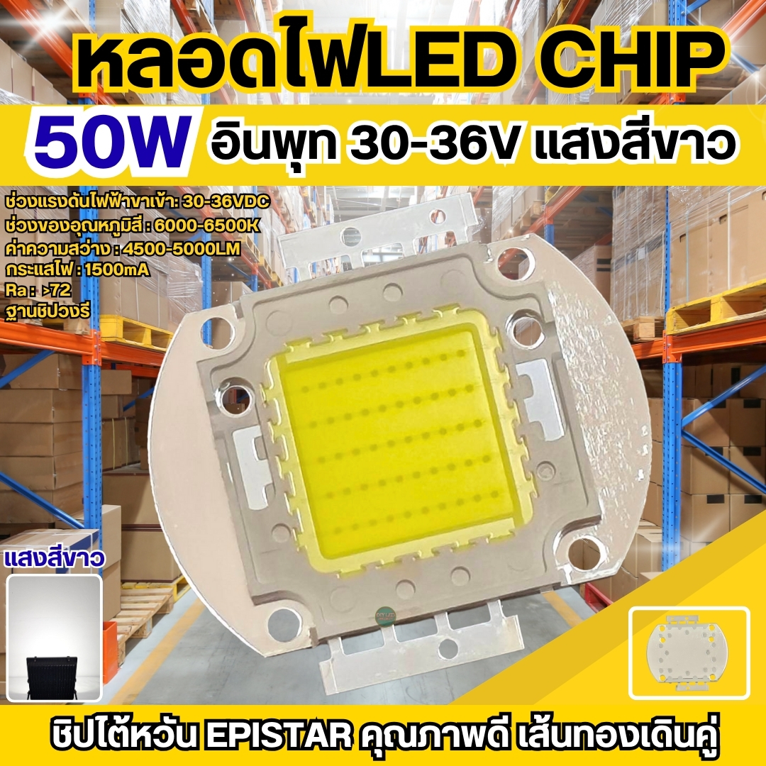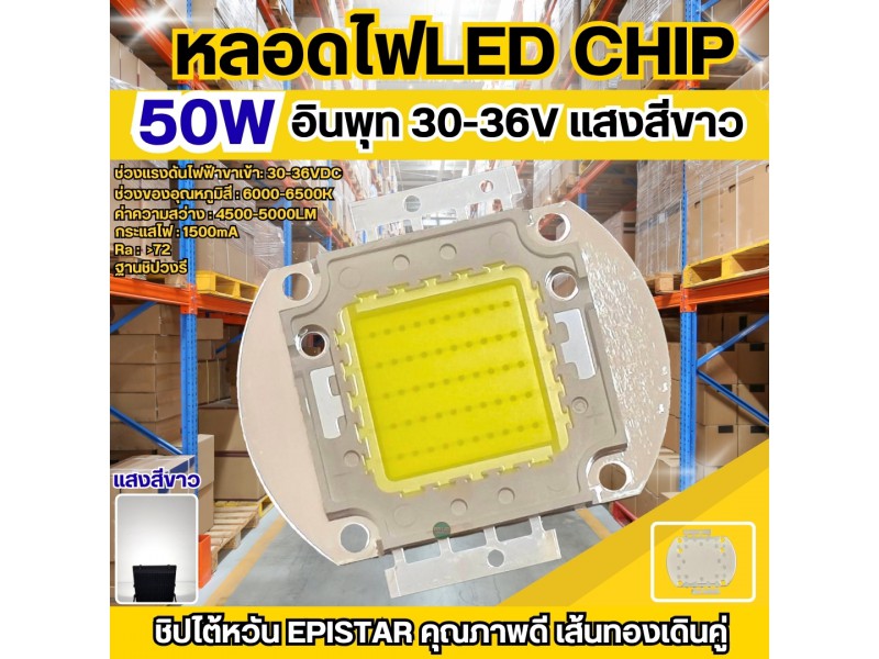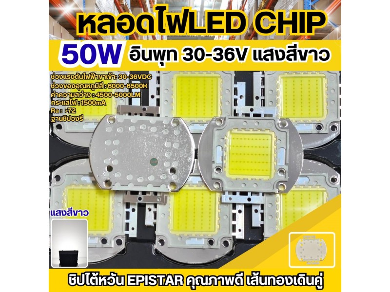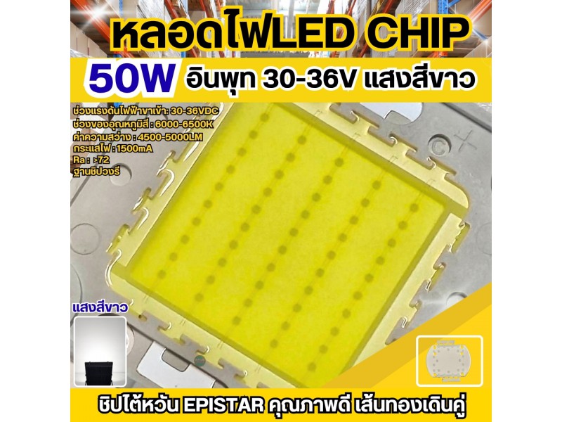 หลอดไฟ LED Chip 50W แสงสีขาว cool white ชิปตัวนี้มีความสว่างของแสงที่มีความแรงมาก ค่าความสว่างที่ได้4500-5000LM เหมาะสำหรับนำมาประกอบเป็นled สปอร์ตที่ใช้ส่องสว่างในพื้นที่โล่งแจ้งหรือติดเป็นไฟโชว์ส่องป้ายโฆษณาขนาดใหญ่ นำไปใช้เป็นไฟสนามต่างๆ เช่นสนามบาส สนามบอล สนามกีฬาหรือสถานที่ต่างๆ หลอดไฟใช้แรงดันไฟDC 30-36V กระแส1500mA
